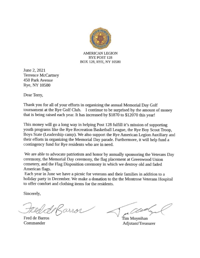 We’d like to thank fellow Rye Post 128 Legionnaire Terry McCartney for his donation to the Post as a result of his Memorial Day Hundy Golf Tournament at Rye Golf Club. Over 70 players and 60+ sponsors participated in the tournament which generated his $12,070 contribution to the Post this week.