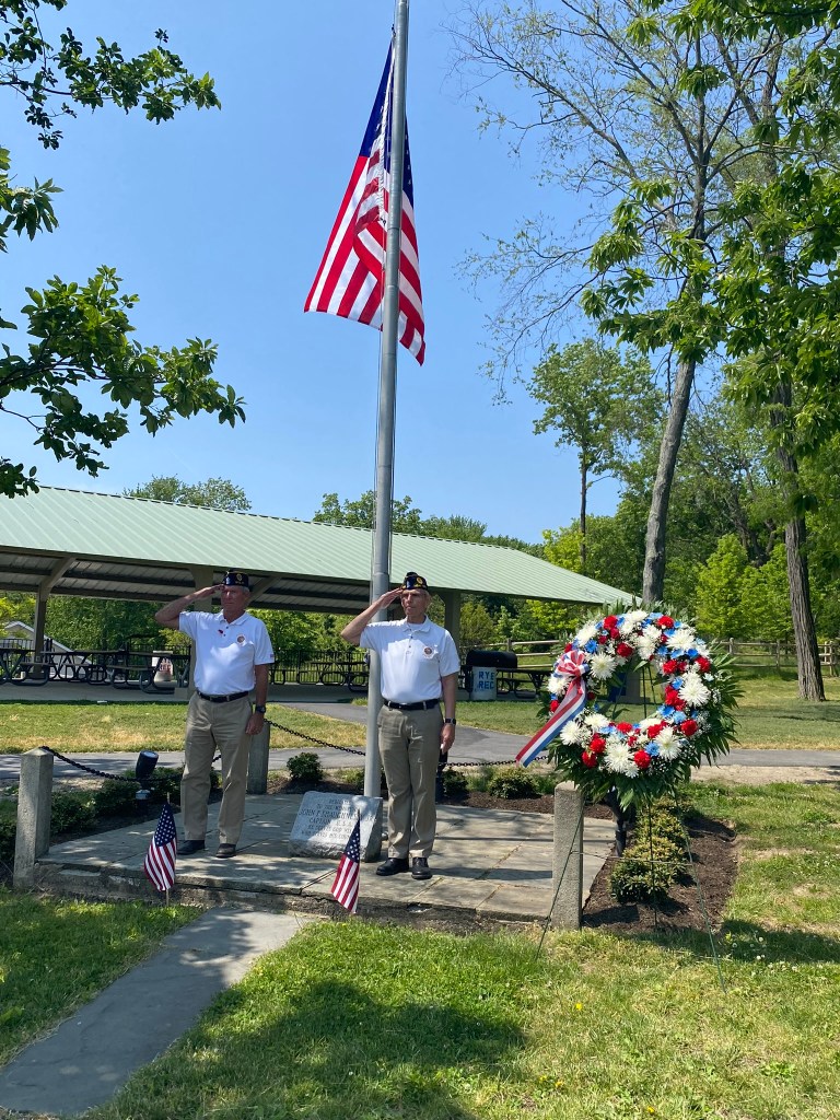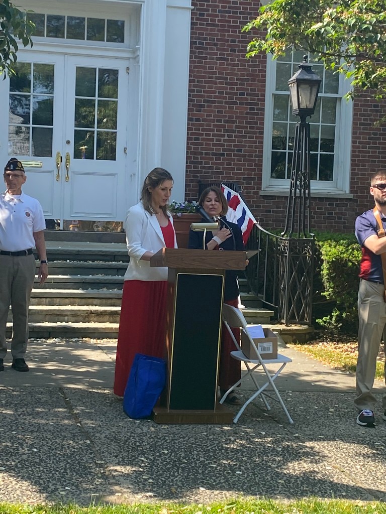 Robin Latimer, president of the Rye American Legion Auxiliary led the crowd in God Bless America. Following the ceremony at City Hall, Commander de Barros and Post Officer Tim Moynihan conducted a brief ceremony at the Shaughnessy Memorial at Rye Recreaction.