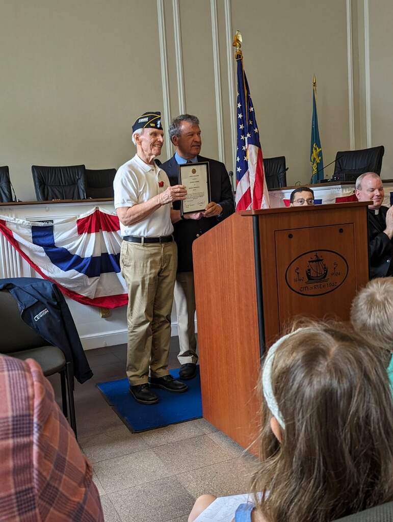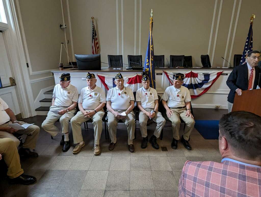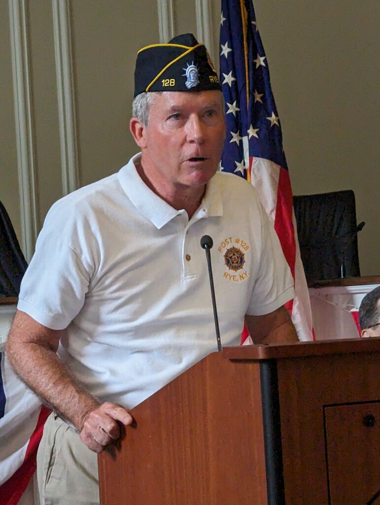 With an overflow crowd at the Rye City Council chamber, American Legion Post 128 Commander Fred de Barros led the ceremony.