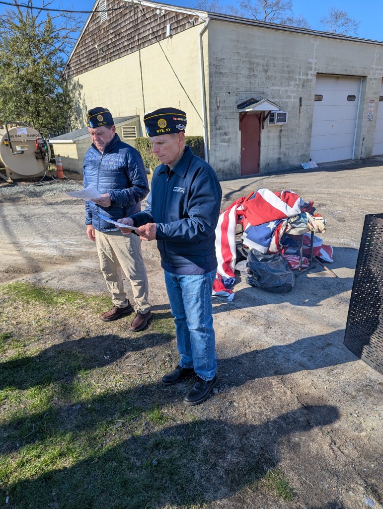 On March 28, 2026, Commander Fred de Barros led the Unserviceable Flag ceremony at the Rye DPW facility. Legionnaires Marc Rappe, Terry McCartney, and John Fray assisted in the ceremony. Thank you to those legionnaires who attended. And special thanks to Fred’s son Erick who helped organize the event. The Rye Fire Department and Police Department paid their respects too.